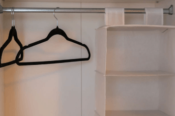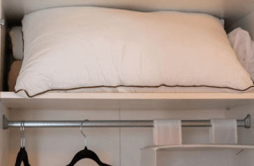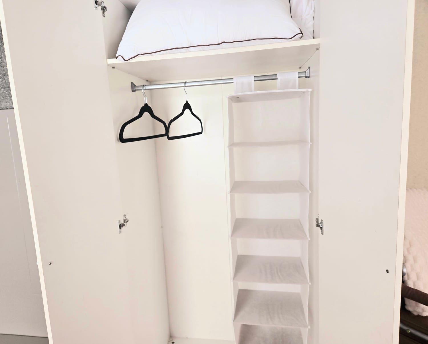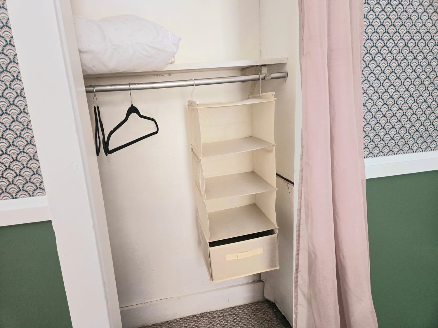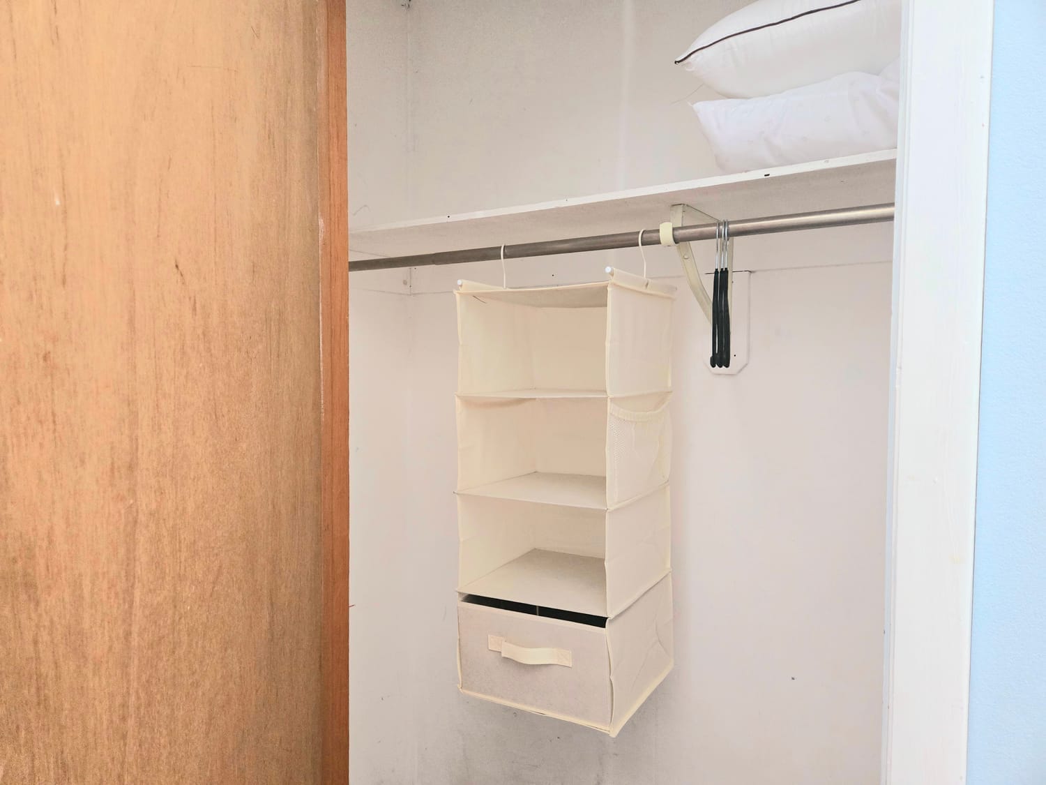 There are 2 bedrooms with closets, each with a single bed. The chair in the one bedroom turns into a single bed.