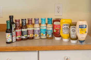 Condiments: sea salt, pink Himalayan salt, pepper, organic olive oil spray, unsweetened ketchup, real mayo, mustard, relish, Primal Kitchen salad dressings, organic coconut amino acid (soy alternative), Worcestershire sauce, Primal Kitchen naturally sweetened BBQ sauce...to name a few
